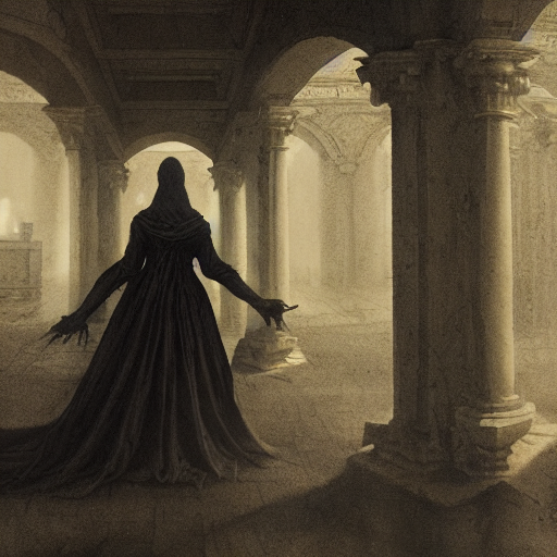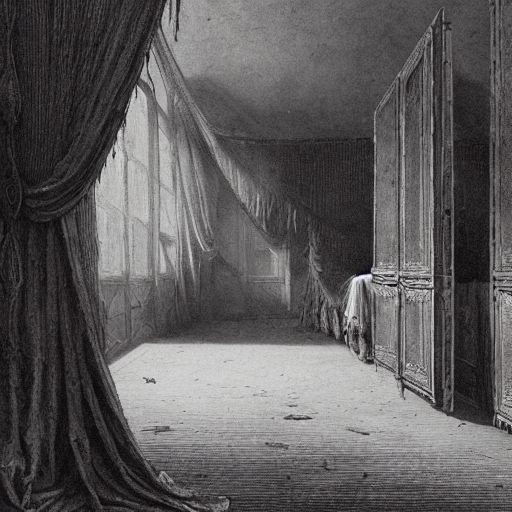 Dark draperies hung upon the walls. The general furniture was profuse, comfortless, antique, and tattered.